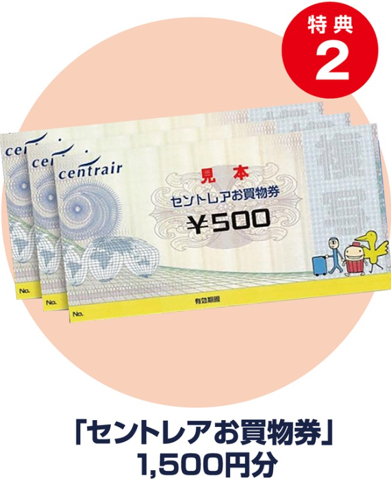 ※特典1,特典2は中部国際空港株式会社が実施する「中部にこやぁ、飛んでセントレア」キャンペーンの特典です。