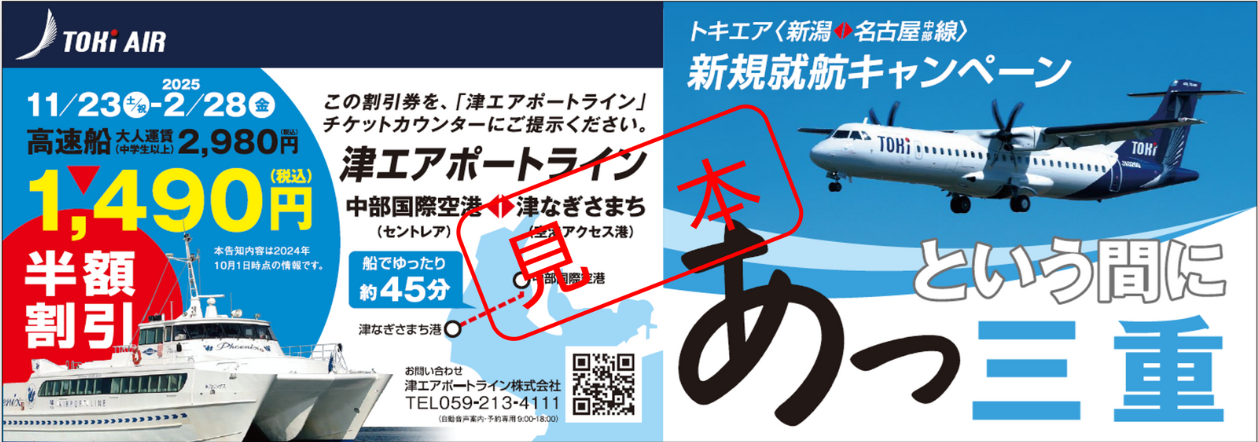上記期間中にトキエア新潟発中部着便(BV401、BV403)機内にて津エアポートライン(高速船)半額券を配布いたします。