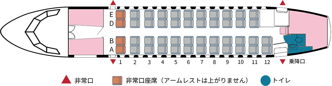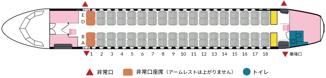 最前列1列目は非常口座席となります。(非常口座席に搭乗には各種条件があります。)